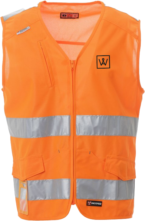 BestellenWarnweste mit 3M-Streifen, Reissverschluss, zwei Vordertaschen mit LOCK SYSTEM im Känguruschnitt, abtrennbarem und verschließbarem Ausweisfach, einer Brusttasche mit Reissverschluss.